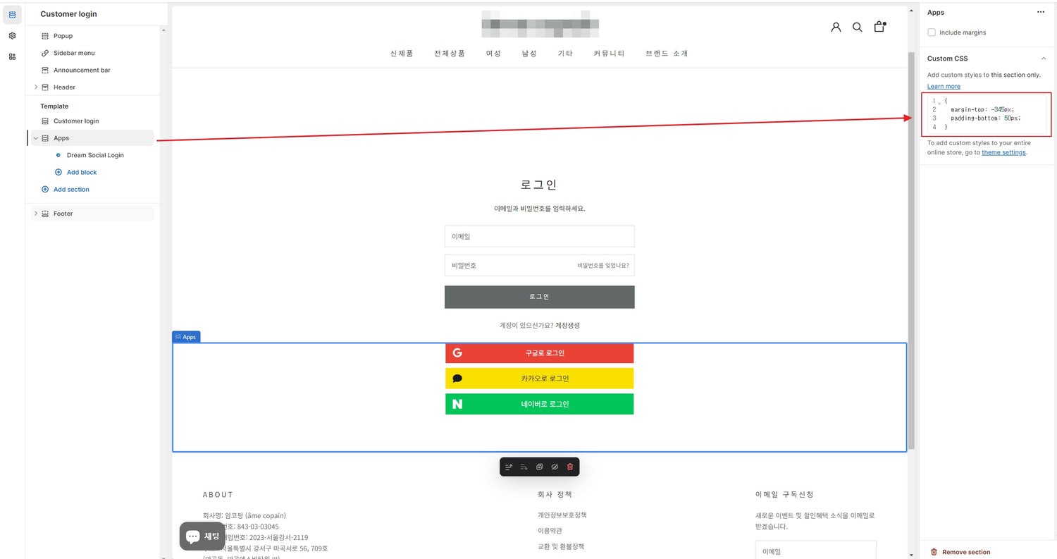 관리자에서 로그인 블럭(Section)의 아래여백을 크게 설정해 놓은 경우 Custom CSS 에 아래 코드를 넣어서 수정할 수 있습니다.