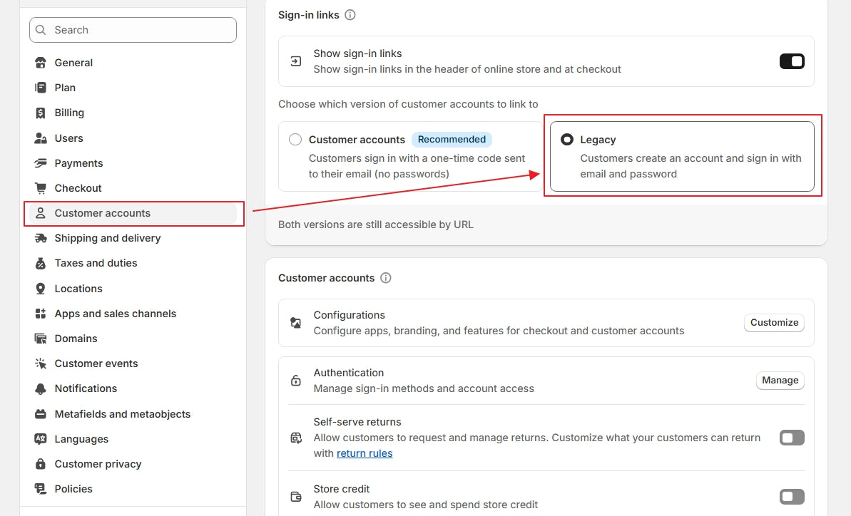 쇼피파이 관리자페이지에서 왼쪽 아래 "설정(Settings)"으로 들어가세요. 왼쪽 메뉴에서 Customer accounts(고객계정)메뉴를 선택하고 Legacy 로그인 방식을 선택하세요.