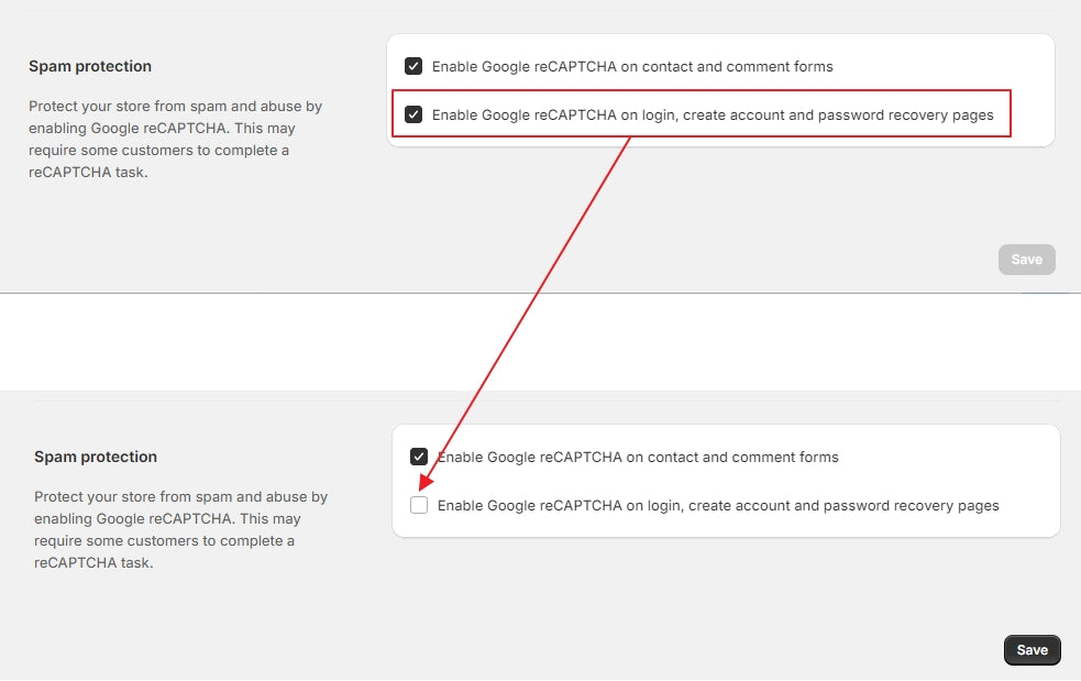 소셜로그인을 활성화하기 위해서는 쇼피파이 관리자 페이지에서 reCAPCHA의 로그인 부분을 비활성화 해야합니다.